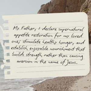 33. My Father, I declare supernatural appetite restoration for my loved one; normalize taste sensations, stimulate healthy hunger, and establish enjoyable nourishment that builds strength rather than causing aversion in the name of Jesus.